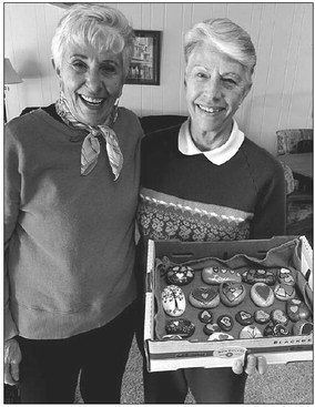 Shuffleboard President Kay Mount (l) of Mutual 15 applauded new member and Evening League Capt. Karen Mendon of Mutual 14 on the surprise she prepared for the Shuffleboard Club Valentine party Feb. 10.