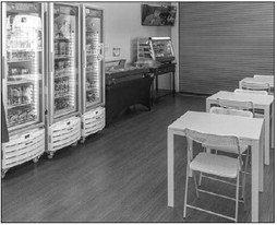The pharmacy recently set up a seating area near its frozen section and hot bar.