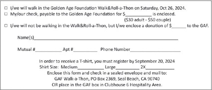 The Golden Age Foundation (GAF) will sponsor a Walk & Roll-A-Thon on Saturday, Oct. 26, from 10 a.m.-2 p.m. starting in the Clubhouse 6 parking lot.