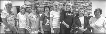 Aug. 24 winners include Elfie Wersching (l-r), Helen Sponseler and Susie Ralston, most buncos; Peggy Clewett, most wins; Joan Simmons and Stella Kaiser, most babies; Diane Seeger, most losses; Dina Navarro, door prize.