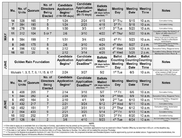 The schedule below indicates each Mutual’s annual meeting date and election, and the deadlines to apply for candidacy. Those who are interested or have questions about becoming a candidate for their Mutual board election can call 562-431-6586, ext. 2329.