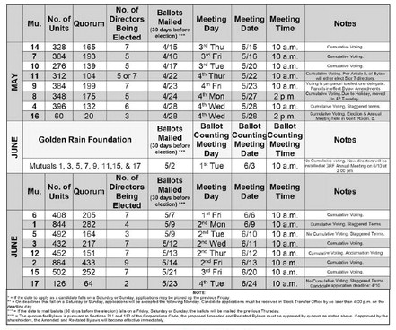LW shareholders/owners are encouraged to attend their Mutual’s annual meetings ( see above). All foundation members are encouraged to attend the GRF annual meeting on Tuesday, June 10, at 2 p.m. in Clubhouse 4.