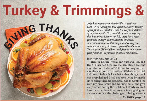 Here in Leisure World, my husband, Joe, and Hui O Hula had been my life. On March 16—the day before our hula club’s 15th anniversary and two months after Joe passed—the GRF declared a total lockdown. Suddenly I was left with nothing to do. I was overwhelmed. I had not been living by myself since college decades ago, and I was mourning Joe with my hula family and working out at the gym daily. Alone during the isolation, I slowly realized how these perilous times were actually giving me a chance to face the challenges of being a recent widow and fending for myself. I learned to reflect and ponder, became an “adult” and tackled independence. It’s been a milestone. I am therefore grateful on this Thanksgiving, even while my future is uncertain in this now unfamiliar world.