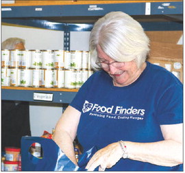 Food Finder volunteer Carolyn Remley works at the pantry bagging groceries for recipients.
