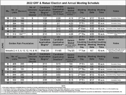 1) Call to Order/Pledge of Allegiance 2) Roll Call 3) President’s Announcements 4) Seal Beach City Council Member’s Update 5) Shareholder/Member Comments 6) Consent Calendar a) Committee/Board meetings for the Month of February i) Minutes of the Physical Property Committee Meeting, Feb. 2 ii)MinutesoftheGRFAdministrationCommitteeMeeting,Feb.3 iii)MinutesoftheCommunication/ITCommitteeMeeting,Feb.10 b) GRF Board of Directors Minutes, Feb. 22 c) GRF Board Report, dated March 22 d) GRF Board Report, dated Feb. 22 e) Acceptance of the Interim Financial Statements for the Month of February f) Approval of the Reserve Funding Investment Purchase 7) Ad Hoc Reports a) Governing Document Ad Hoc Committee—Discussion b) Strategic Planning Ad Hoc Committee—Discussion c) Website Ad Hoc Committee—Discussion d) Bulk Cable Ad Hoc Committee—Discussion 8) New Business a) General i) Change of Date - 5 percent Increase Economic Adjustment ii) Face Mask Requirement at Trust Property and Meetings iii) Operating Funding Request—Spam Filter Licensing iv) Reserve Funding Request—Emergency Service—Sewer Line Repair, El Dorado Road b) Finance Committee i) Acceptance of the Final Draft of 2021 Audited Financial Statements ii) TENTATIVE VOTE: Amend 40-5061-2, Fees c) GRF Administration Committee i) Amend 50-2182, Member/Owner Renter/Lessee-Rules ii) TENTATIVE VOTE: Amend30-5093-1,AuthorizedResident Rules of Conduct iii) Amend 30-5024-1, Committee Structure d) Physical Property Committee i) Reserve/Capital Funding Request—Woodshop Improvement in Clubhouse 1 ii) Capital Funding Request—Electrical Engineer—Clubhouse 1 iii) Capital Funding Request—Clubhouse 6 Door Openers iv) Amend Policy 30-5041-5, Real Trust Property Acreage e) Recreation Committee i) Reserve Funding—Aquatic Center Furniture ii)Approval—GolfBallRemoval—TurtleLakeatGRFGolfCourse iii)ReserveFundingRequest—Clubhouse3IceMachineReplacement iv) Approval—Amphitheater Sound and Lighting Contract v) TENTATIVE VOTE: Amend 70-2504-2, The Library Fees vi) Amend 70-1468-1, Swimming Pool Rules vii) FINAL VOTE: Adopt 70-5563-1, Needle Art Studio viii) Amend 70-1429.01-1, Golf Course Regulations f) Security, Bus & Traffic Committee i) Approval—Reinstatement of Parking Tickets ii) Reserve Funding Request—GRF Vehicles—Minibuses Purchase iii) Capital Funding Request—LED Lighted Stop Signs iv) Amend 80-1937-1, Parking Rules 9) Board Member Comments 10) Next Meeting April 26, Clubhouse 4/Virtual 11) Adjournment