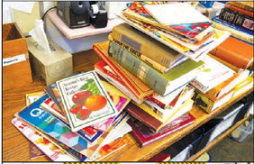 store or take a seat among the books. Below: Dona tions are sorted and shelved by volunteers, with some books landing outside, ready to be bagged and bought.
