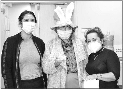 Patty Jo Schmidtz stopped by the HCC's ice cream social on April 13 dressed as the Easter Bunny. Schmidtz was welcomed by Grecia Nunez (l), HCC senior ambassador, and Pilar Looney, a representative of Eureka Insurance Solutions.