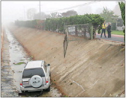 As she maneuvered, she noticed an obstruction in the roadway and attempted to brake, but mistakenly pressed the accelerator instead. The driver lost control of the vehicle, striking the chain link fence and gate before the vehicle careened into the flood channel.