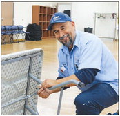 Innnovative Cleaning Services custodian Salvador Moreno (l) and supervisor Selvin Deleonhaul fold-out tables for an event in Clubhouse 6.